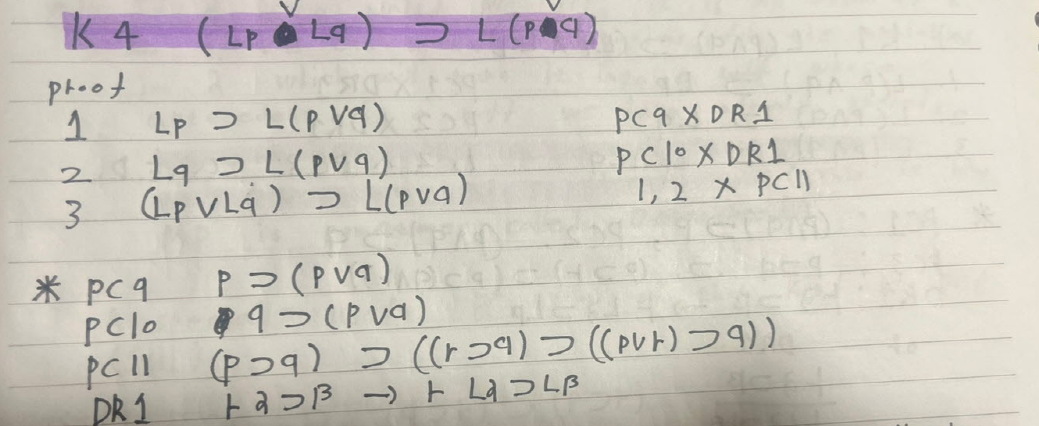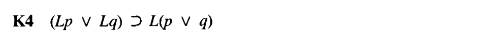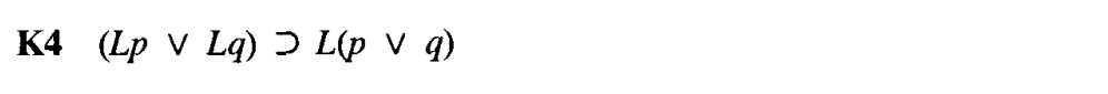 ※ Note that K4, unlike K3, is only an implication, not an equivalence. The converse of K4 is not a theorem of K, and in fact at the intuitive level is not a valid formula: it may be necessary that you are awake or asleep without its being necessary that you are awake or its being necessary that you are asleep.