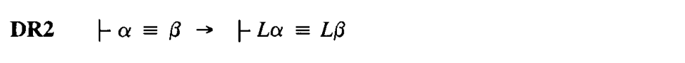 - (e) if α is any wff which is built up from γ using ~ and L as the only monadic operators and ∨ as the only dyadic one, and β is built up from δ in exactly the same way as α is from γ, then if γ ≡ δ is a theorem, so is α ≡ β.