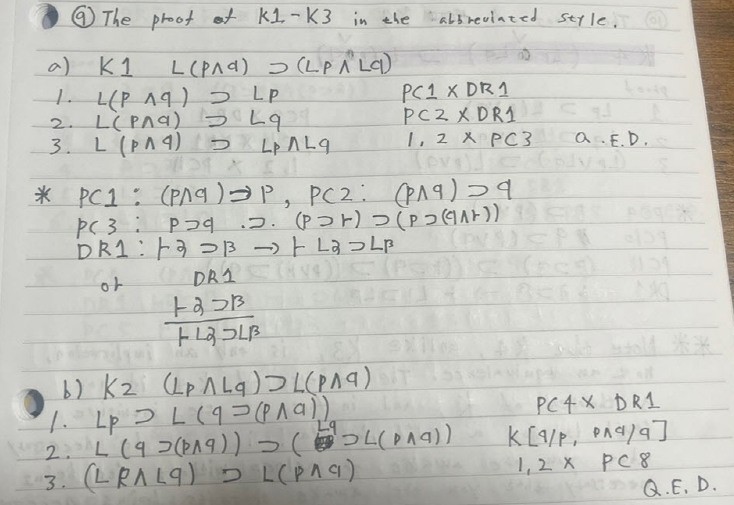 K1(L(p ∧ q) ⊃ (Lp ∧ Lq)) + K2((Lp ∧ Lq) ⊃ L(p ∧ q)) = K3