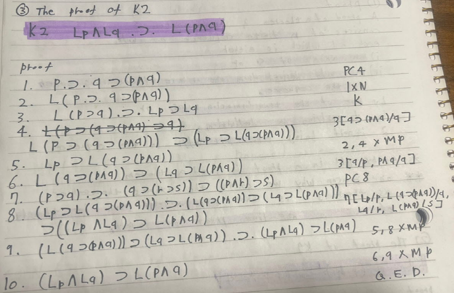K2 (Lp ∧ Lq) ⊃ L(p ∧ q)