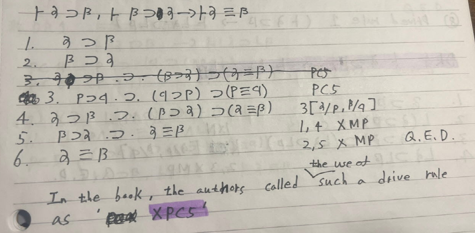 we can use PC51 in this way not only in the case of K1 and K2, but whenever we have already proved both a wff of the form α ⊃ β and its converse β ⊃ α; i.e. by substituting α for p and β for q in PC5 and applying MP twice, we can obtain α ≡ β.