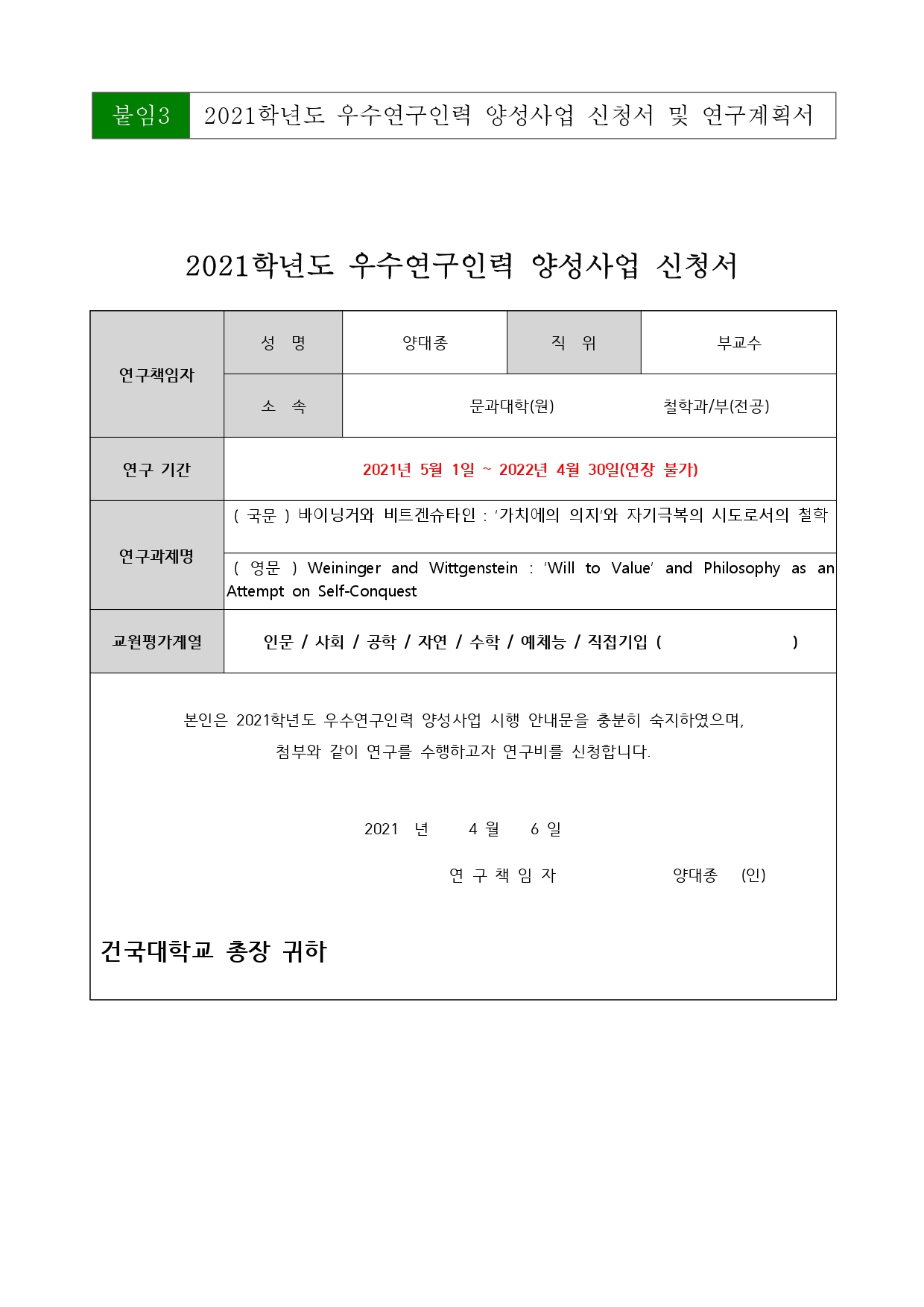 2021학년도 우수연구인력 양성사업 신청서2023.12.21 - [Research/Publications] - 전기 비트겐슈타인의 철학에 나타난 바이닝거적 세계관의 극복-자살에 관한 윤리적 성찰을 중심으로- 전기 비트겐슈타인의 철학에 나타난 바이닝거적 세계관의 극복-자살에 관한 윤리적 성찰을 중김현균. (2022). 전기 비트겐슈타인의 철학에 나타난 바이닝거적 세계관의 극복-자살에 관한 윤리적 성찰을 중심으로-. 범한철학, 104(1), 173-212.georgia15.tistory.com