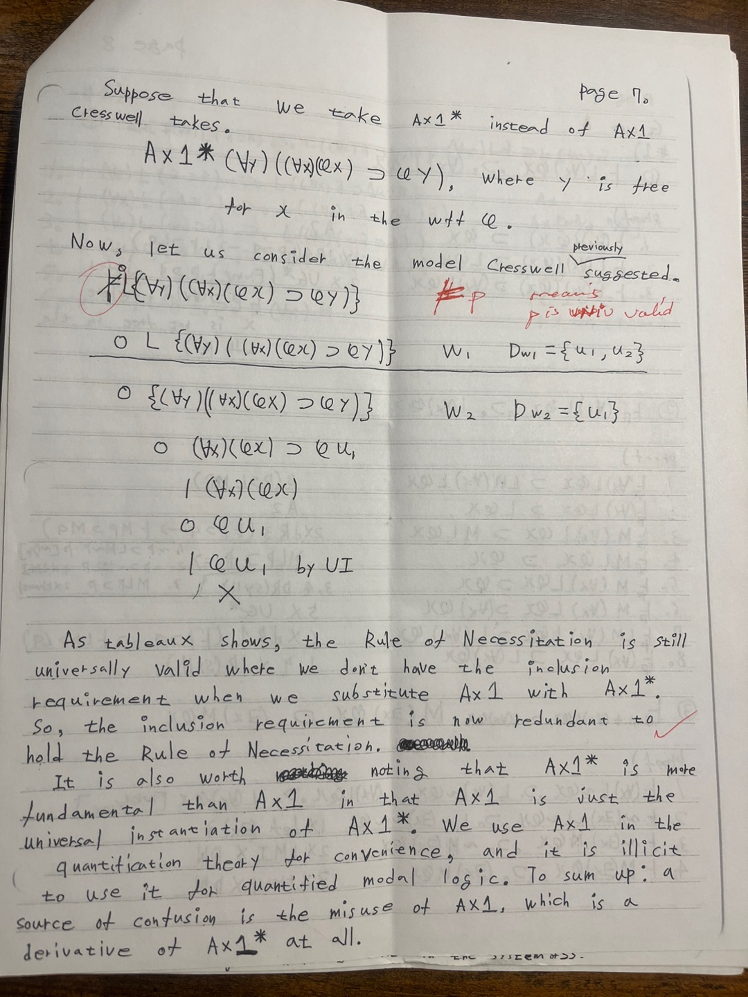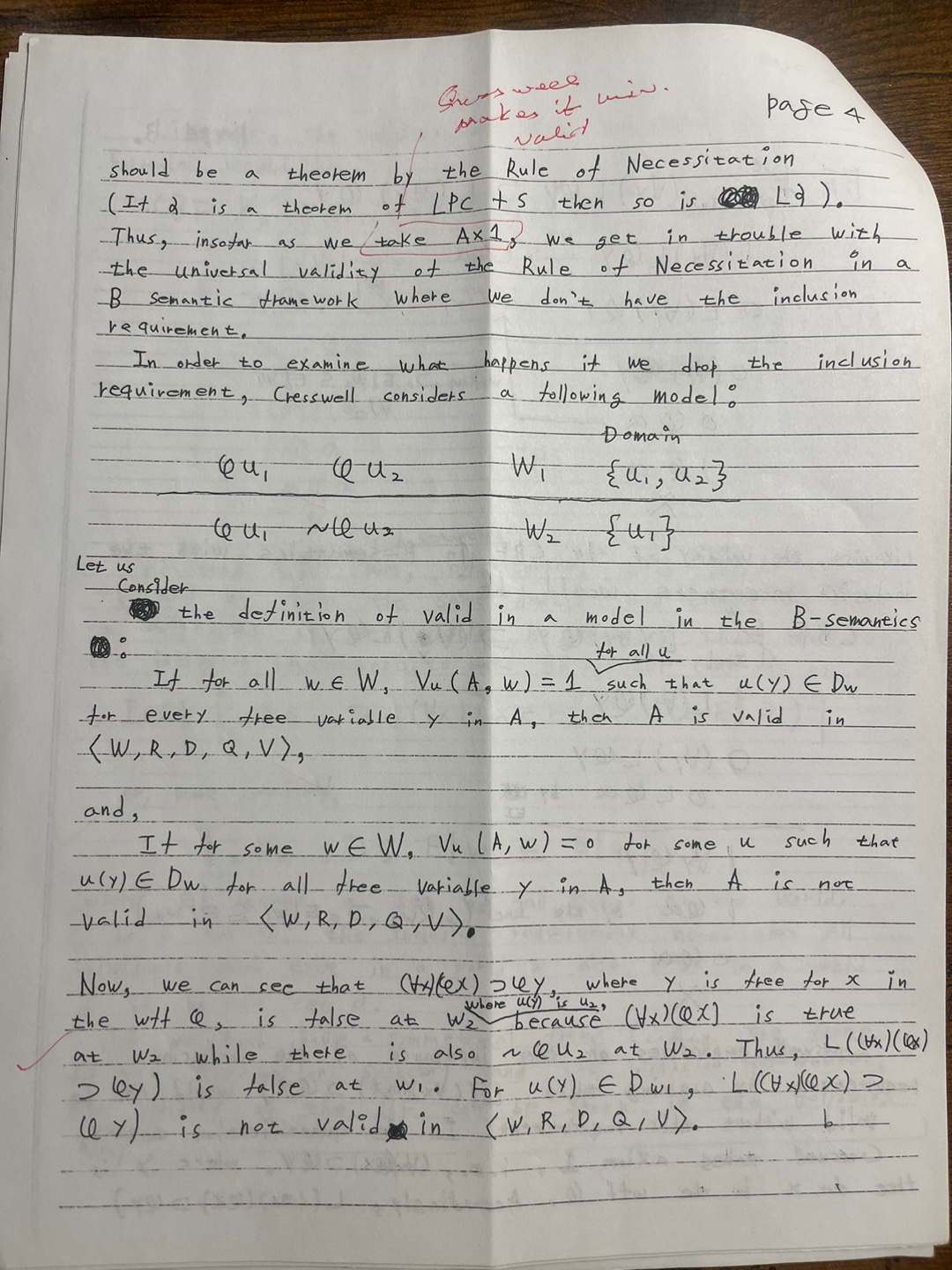 How does Cresswell (book) address the validity of this wff in a B semantics (p. 275 f). Explain why in a B semantic framework where we don’t have the Inclusion Requirement, we get in trouble with the universal validity of the Rule of Necessitation. How then is universal validity and invalidity defined in a B semantics without inclusion requirement. Show how the inclusion requirement resolves this issue. Explain how we resolved the issue in class by rejecting Ax1 in favor of a quantification theory with: