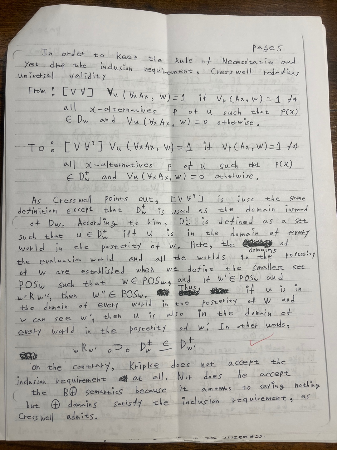 Explain why on this notion of universal validity, if we drop the inclusion requirement, then L((∀x)Ax ⊃ Ay) is no longer universally valid. Thus the rule of Necessitation would fail. How does Cresswell redefines universal validity to keep the rule of Necessitation and yet drop the inclusion requirement. (I.e., explain the B+ semantics which introduced the “Posterity of w” and also introduces: Vu( ∀xAx, w) =1 if Vp(Ax , w) = 1 for all x-alternatives p of u such that p(x) ∈ D+w. Vu( ∀xAx, w) = 0 otherwise.